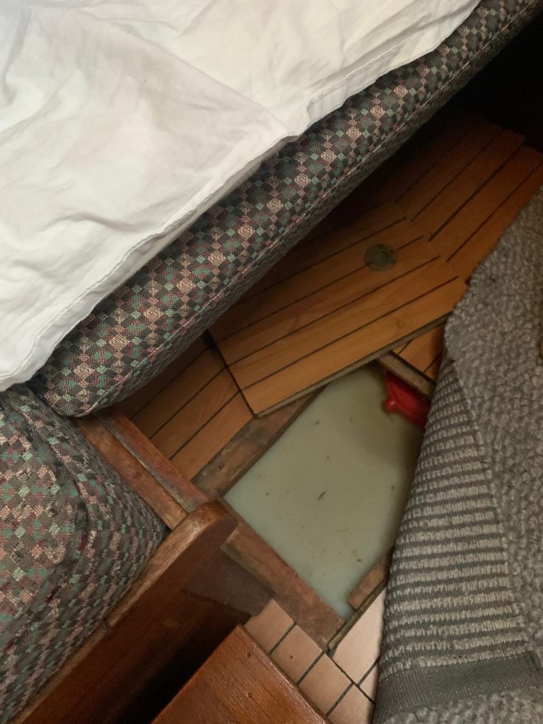 To access the fresh water tank, remove the floor panel in the kitchen.